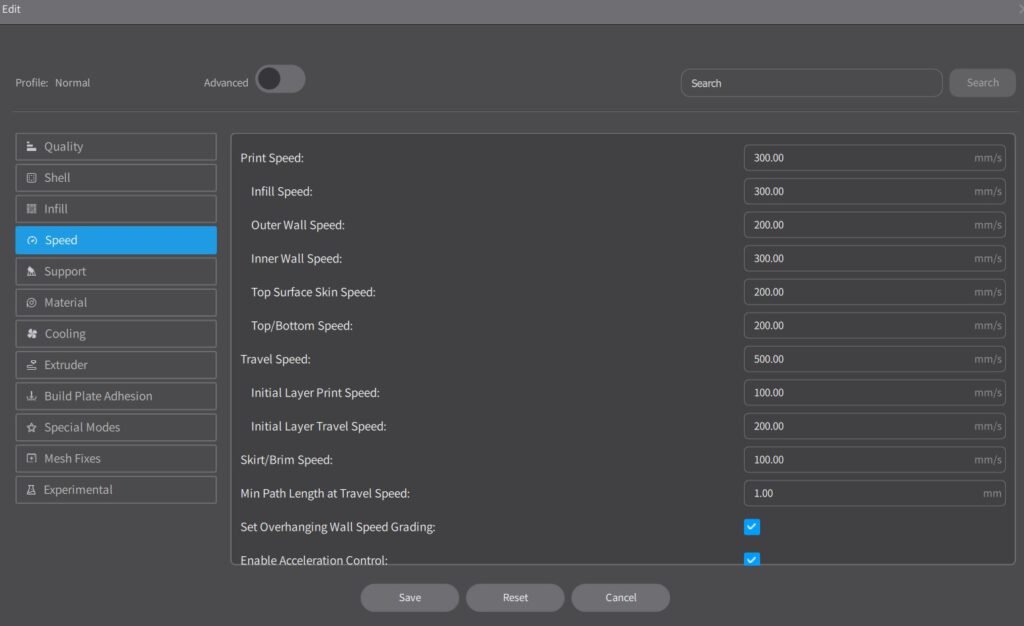 Print Speed | Druckgeschwindigkeit (gesamt) | Grundgeschwindigkeit beim Drucken – alles außer Leerfahrten. Viel = schnell, aber fehleranfällig. |