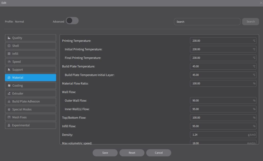 Density | Dichte des Filaments | Wird für Kosten- und Verbrauchsberechnung genutzt – z. B. PLA ≈ 1.24 g/cm³. |
